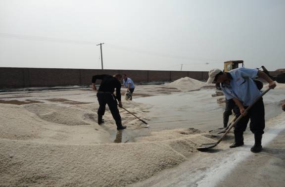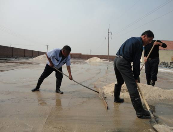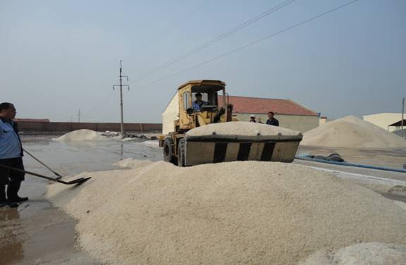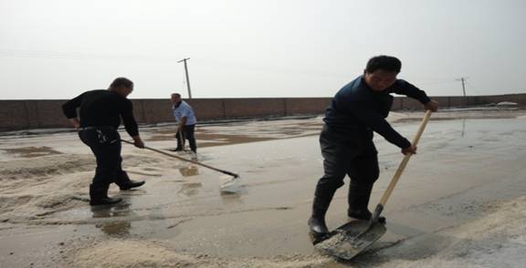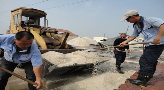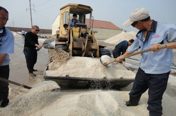 鏟車(chē)不滿(mǎn)時(shí),工人們一掀一掀的把鹽裝進(jìn)鏟車(chē)